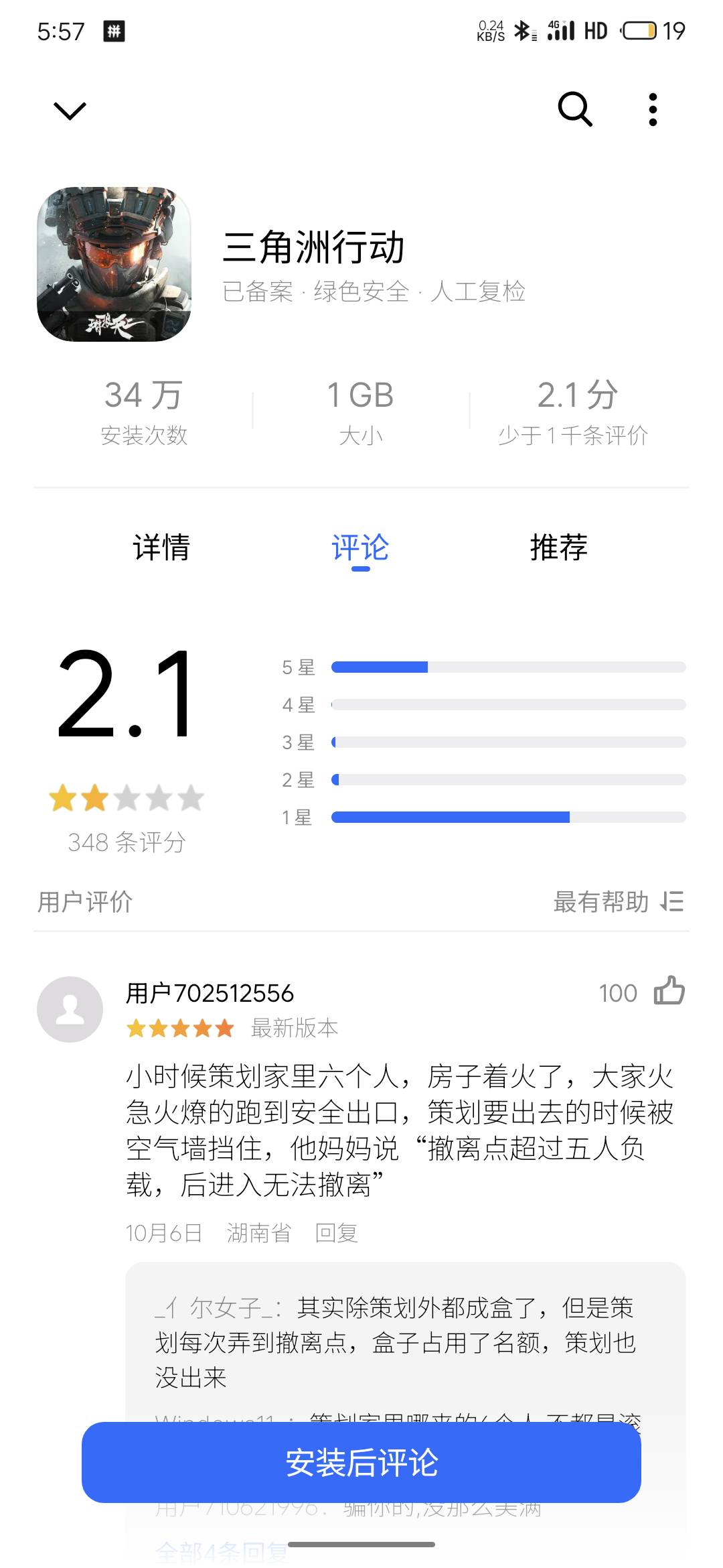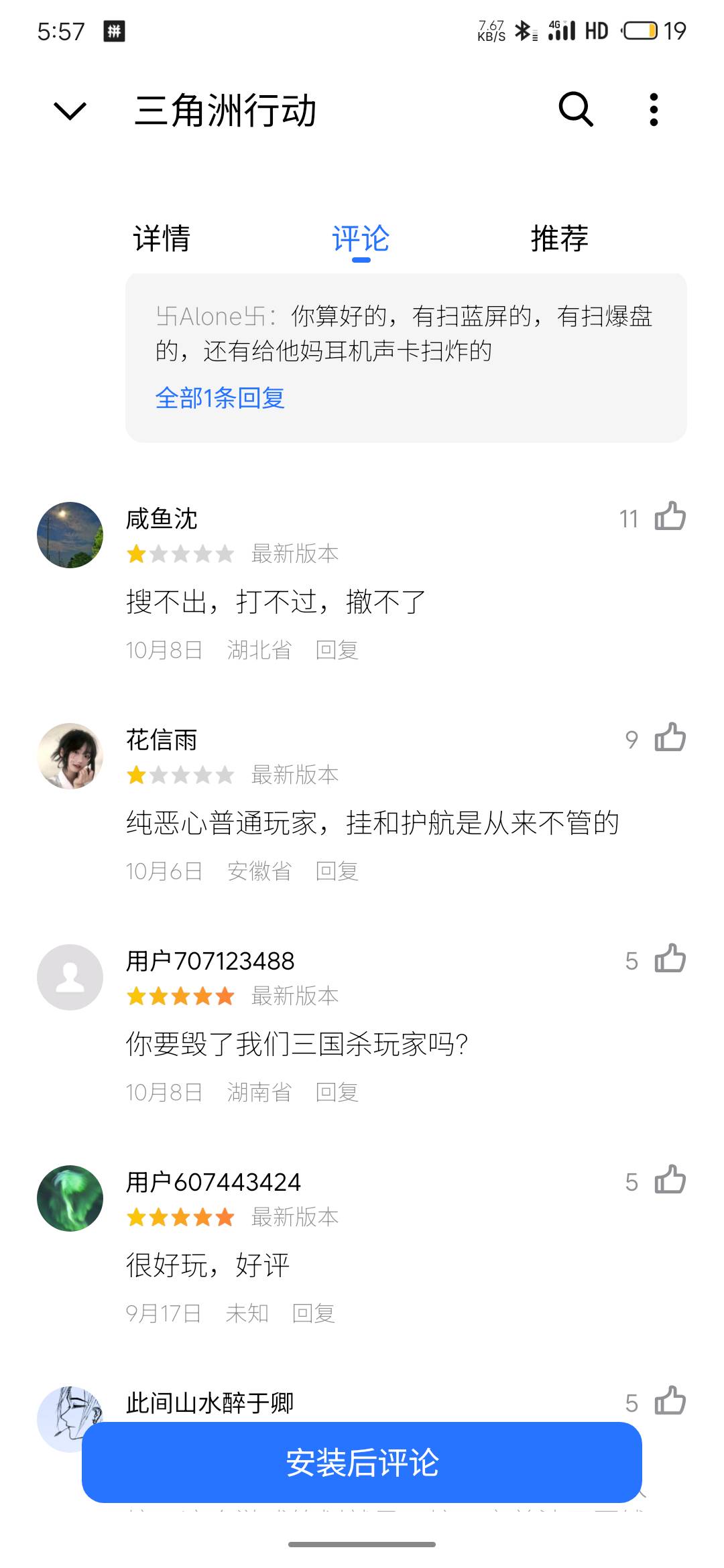 虽然不是一个服务器的三国杀但是这个分数未免高的离谱了,怎么能和这个游戏差这么多分数?他们玩家不会给自个儿游戏打差评给我们杀游打好评吧?